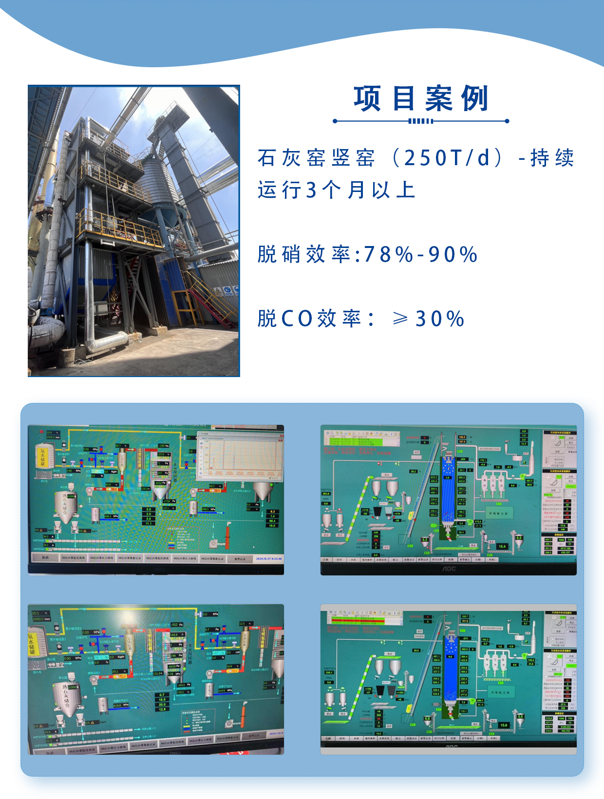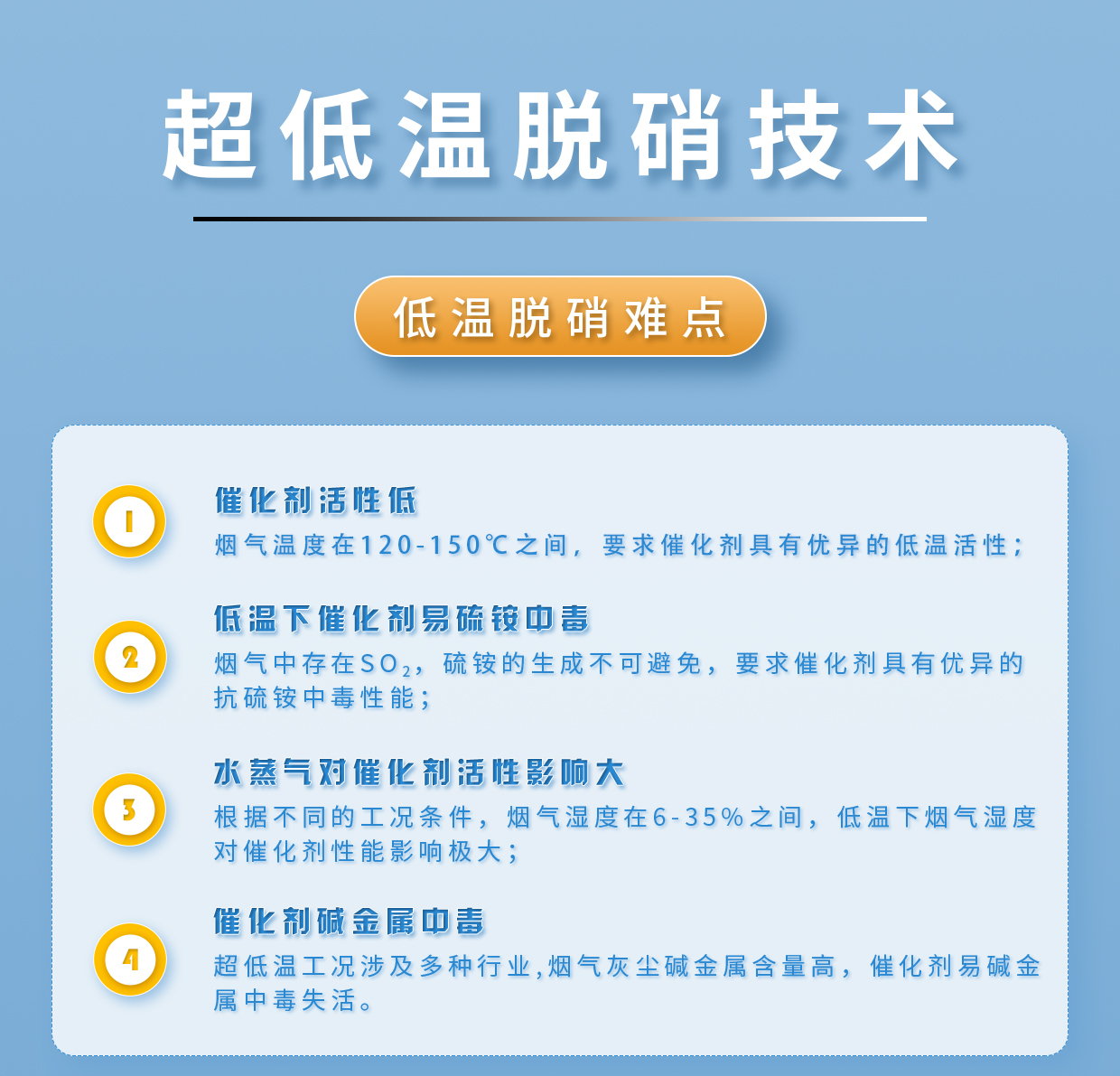 適用工況 低溫煙氣工況,僅要求煙氣溫度≥120℃;煙氣含水量差異大,可達在10%~40%(vol%);可適應危廢焚燒行業、垃圾焚燒行業、白灰行業、鋼鐵行業工況煙氣超低溫脫硝;