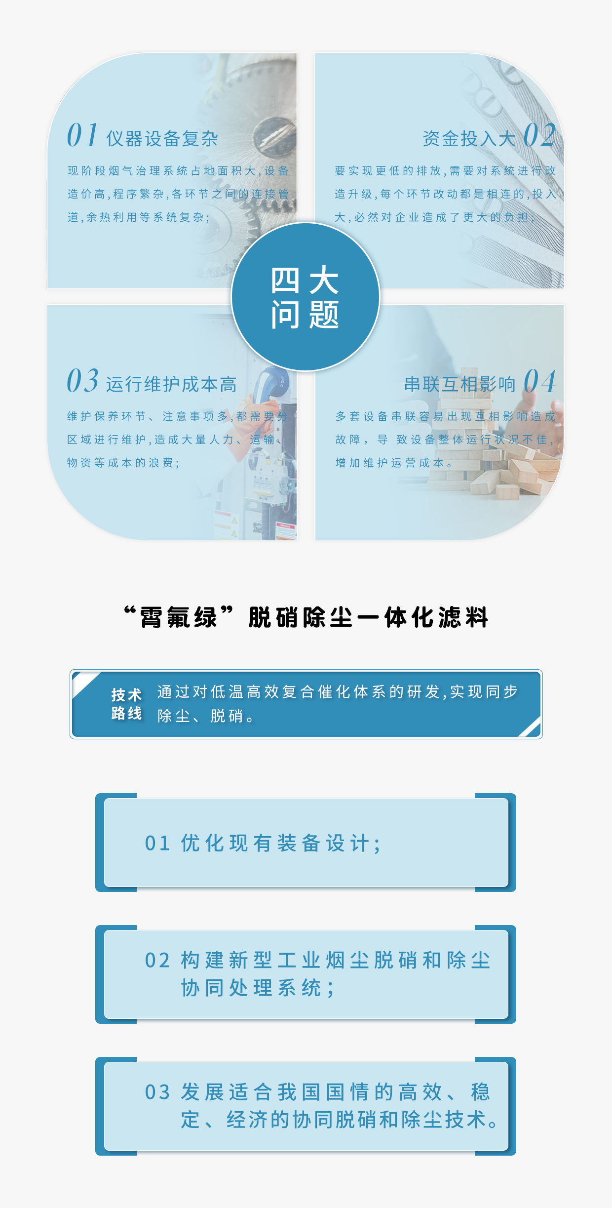 | 應用場合 | 硫含量低、水含量低、過濾精度 較低的場合代替布袋與部分SCR脫硝催化劑 |